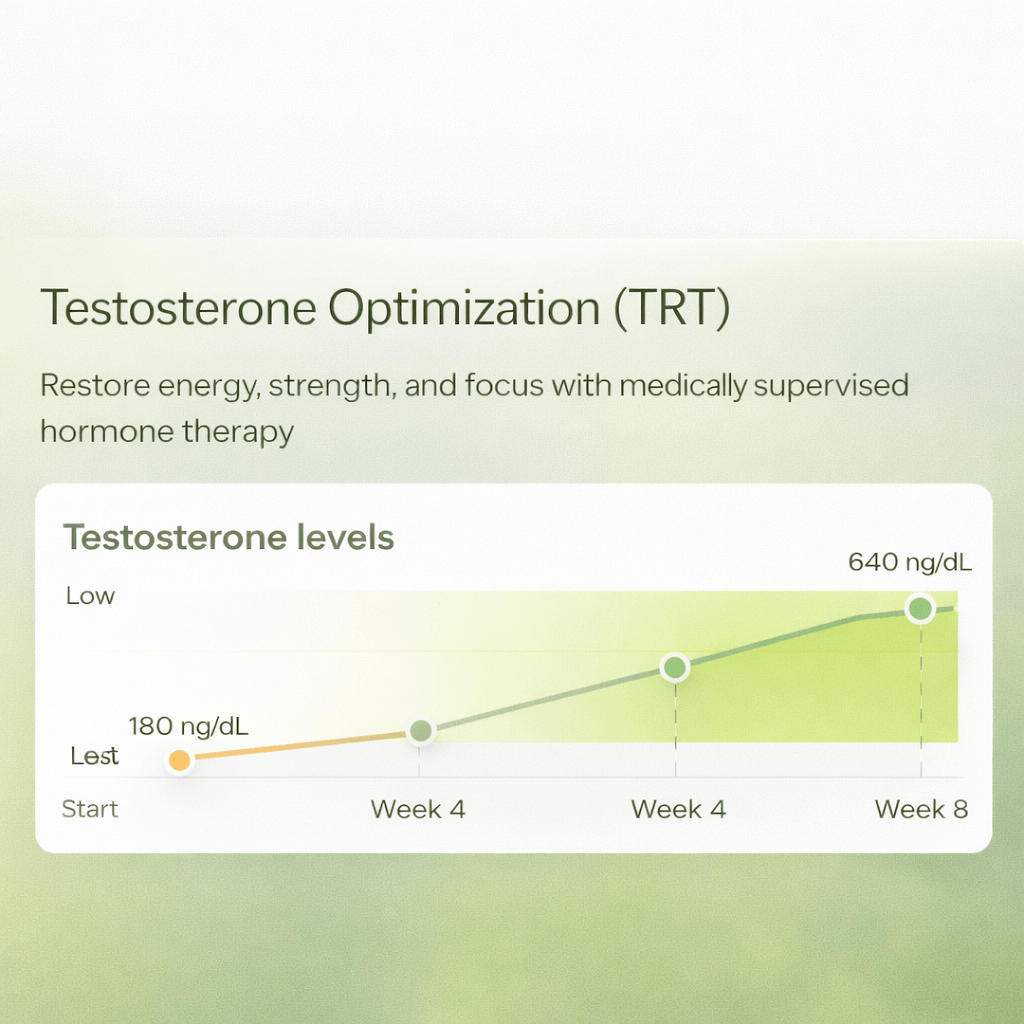 Low testosterone can affect your energy, mood, strength, and confidence. Our personalized TRT program helps restore balance so you can feel strong, focused, and motivated again.